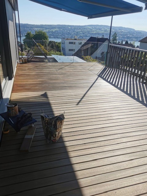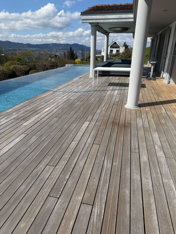 Holzbeläge im Aussenbereich sind während einer Jahreszeit verschiedensten Wetterverhältnissen ausgesetzt. Das Holz wird stark beansprucht und dabei auch verschmutzt. Damit das Holzdeck seinen Zweck sicher erfüllen kann, empfehlen wir eine regelmässige Überprüfung (evtl. Ersatz von schadhaften Lamellen) sowie Reinigung des Belages. Die Lebensdauer des gesamten Holzdecks wird dadurch entscheidend erhöht.